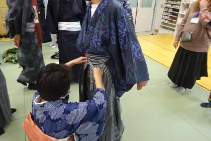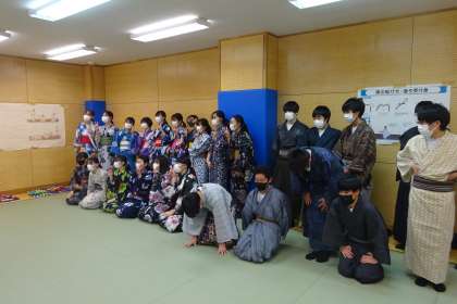 女子の帯は少し苦労していましたが、最後はみんなで笑顔で写真撮影していました。