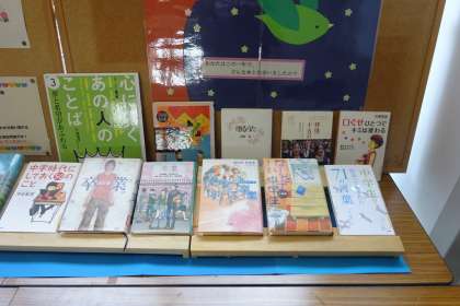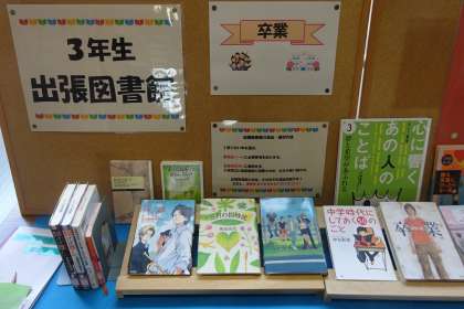 卒業間近の3年生に向け、出張図書館には「卒業」をテーマにした本が掲示されています。