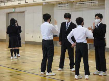 授業の様子 公開日 2022/04/15 更新日 2022/04/15 今日のできごと 3年生は体育大会でのリレーの走順決めの時間です。どの順で走ると有利なのか、様々な意見を出し合い、真剣に話し合っていました。2年生はアイスブレイクにも使われる、バーステーラインというゲームで新クラスのメンバー同士力を合わせていました。会話をせず、身振り手振りだけでお互いの誕生日を把握し合い正しい順番で並ばなければいけないこのゲーム、うまく並べたクラス、うまくいかなかったクラス、盛り上がっていました。 いいね(0)