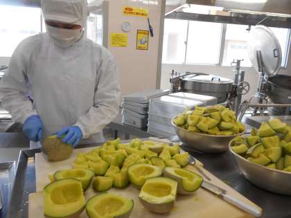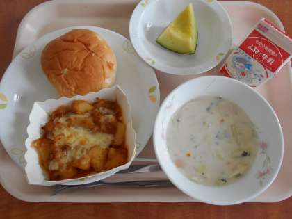 *給食室より 今日のくだものはアムスメロンです。八百屋さんが、みずみずしい甘いメロンを持ってきてくれました。今日もおいしく食べてほしいです。