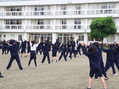 富士山を背に朝会とラジオ体操。ウグイスの声を聞きながら爽やかな空気をたくさん吸いました。