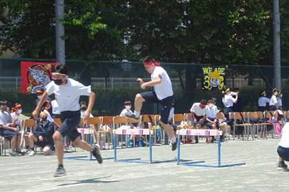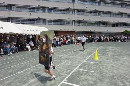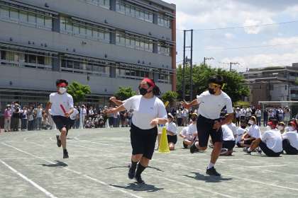 障害物走、3年全員リレー、午後の初めは新規種目の部活動対抗リレー。オフィシャル部門とエキシビジョン部門に分かれて行いました。エキシビジョン部門では各部活動で使っているものをバトンにして、披露することを主に行っていました。