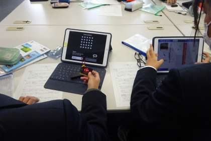 タブレットで作成されてプログラムが音や光の移動などを表現します。生徒は簡単そうにやっていますが。。。