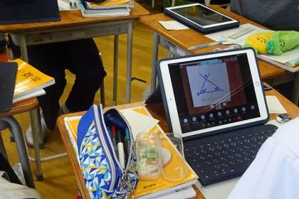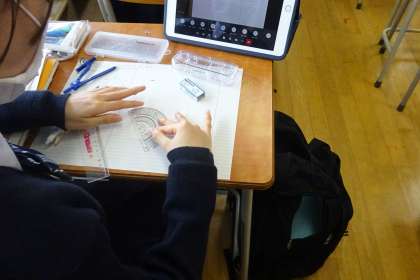 三角形の合同条件を学ぶため、まずは一つの三角形と合同になる三角形を定規やコンパス、分度器などを用いて書いてみました。