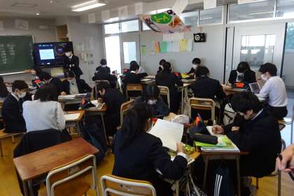 1年社会 公開日 2022/12/14 更新日 2022/12/14 今日のできごと 教員の授業力向上のための研究授業です。 1年生の社会科は、今日から「世界各地の人々の生活と環境」の単元に入ります。本時の授業では世界の住居にはどのような違いがあるかを個人で考え、グループで共有することをしていました。 多様性を理解できるようになったり、他の人の考えから多面的・多角的に考えることができる力を伸ばしてほしいです。 いいね(0)