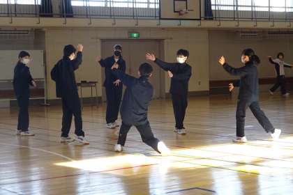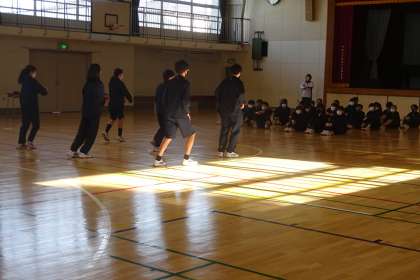 1年体育 ダンス 公開日 2023/02/01 更新日 2023/02/01 今日のできごと 体育の授業では全学年ともダンスに取り組んでいます。 1年生は今日が発表の日。1時間で基本的な動作を覚え、3時間でグループで演技の完成度を高めました。基本のダンスはどのグループも一緒ですが、隊形などを工夫したり、個人演技を取り入れたりとグループ独自の面白さもありました。 短い時間での学習でしたが、素晴らしい表現でした。 いいね(0)