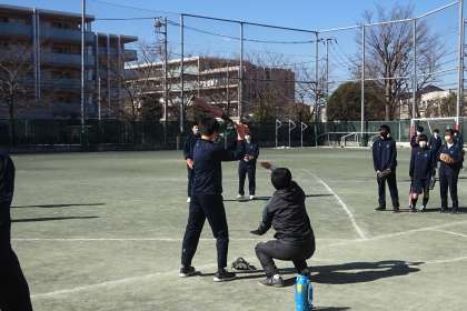 トスバッティングで投げる生徒は、安全のためネット後方から投げます。