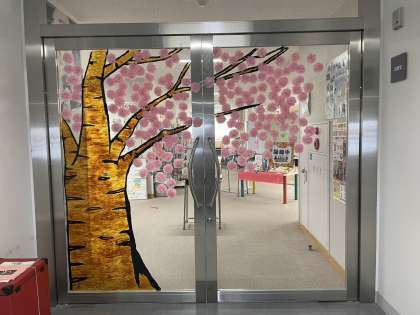 卒業を祝して、図書館の入り口を満開の桜にしました。