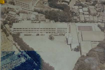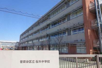 開校当初は本日配布した文書に画像があるように、木造校舎でした。そして、建て替えられ、画像上段の上から見た桜木中学校となりました。よく見ると左上に鴎友学園が見えますので、現在の正門側の通りに沿って校舎があったのがわかります。