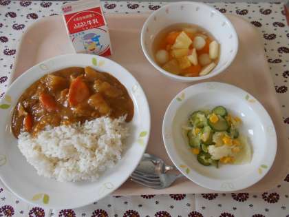 ☆献立 チキンカレーライス 牛乳 コーン入りフレンチサラダ フルーツ白玉