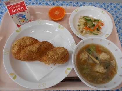 ☆献立 あげパン 牛乳 春雨と肉団子のスープ 中華サラダ マンダリン