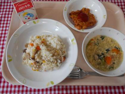 ☆献立 ウインナーとコーンのピラフ 牛乳 大豆とコーンのフリッター 卵スープ