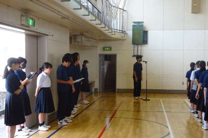 久しぶりに体育館に全校が集まって生徒会朝会を行い、生徒会長、各種委員長からこれまでの委員会の反省や改善点、全校生徒への呼びかけなどの話がありました。また、学芸行事委員長や選挙管理委員長からも2学期の行事に向けて説明などがありました。