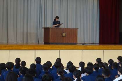 人数が多くなっている分、階段や体育館入口で混雑で待つ時間が多くなりました。開始時刻25分に開始できるよう早めの行動が必要です。また、代表生徒が壇上で礼をしたときに、号令がないので自然に例ができるようになるといいですね。(以前はできていたと思います。コロナで集まる機会が無くなり、忘れてしまったような気がします)