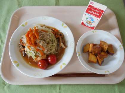 ☆献立 冷し中華 牛乳 キャラメルポテト ミニトマト