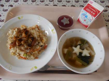 今日は「七夕給食」です。願いが届くように、スープとゼリーに☆を散りばめました。