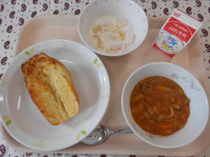 ☆献立 ガーリックトースト 牛乳 ビーンズシチュー フルーツヨーグルト