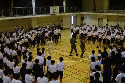 笑顔と学びの体験活動プロジェクト 公開日 2023/07/18 更新日 2023/07/18 今日のできごと 元在籍していた本校教員と縁のある劇団員が、進路相談で後押しいてくれた担任の話をしてくれ、中学生に夢を与えてくれました。 最後は全校生徒が手と足で音を出しひとつになり、終了です。 なお、このプロジェクトのアドバイザーをしている尾木直樹氏が見学してくれて、素直に参加し、真剣に見入り、切り替えの素晴らしさを褒めていました。 いいね(0)