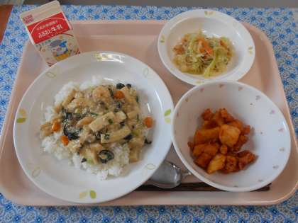 ☆献立 海鮮あんかけ丼 牛乳 鶏肉とじゃがいもの炒め物 パンサンスー