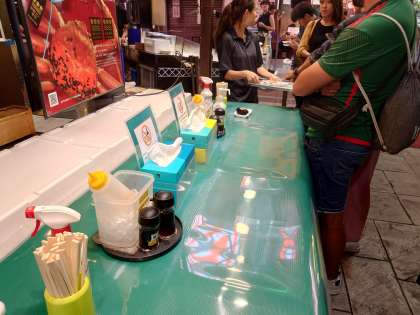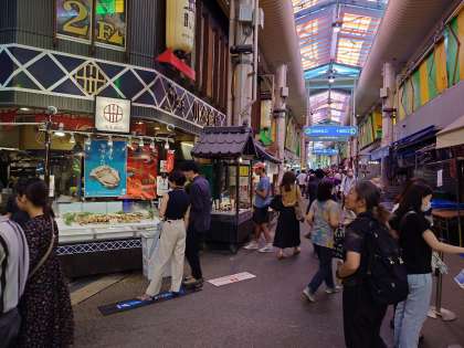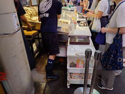 近江町市場に来ました。海鮮を店前で食べていますが、うちの生徒はいませんでした。