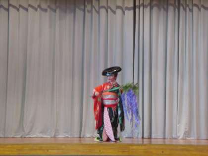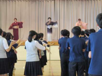 日本文化体験 日本舞踊 公開日 2023/09/26 更新日 2023/09/26 今日のできごと 3年生の日本語の授業の一環として、日本舞踊体験を実施しました。日本舞踊について解説を受け、実際に舞を見ました。初めて日本舞踊を見る生徒も多く、日本舞踊独特のリズムにのって体を動かしたり、恵比寿とおたふくの面をつけた舞については、「どうやって面を早替えしているのか」と質問をしたり、良い時間になったようです。 いいね(0)