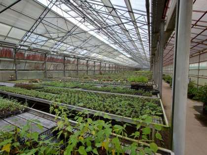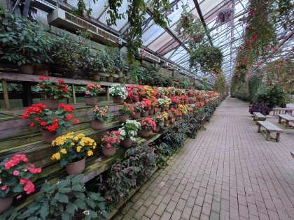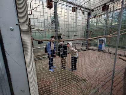鳥かごの中に入って、近くで見学する生徒もいました。 花がたくさん育てられています。