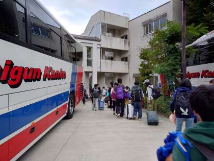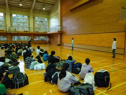 林間学園に到着しました。開校式でお世話になる学園の方にあいさつしました。