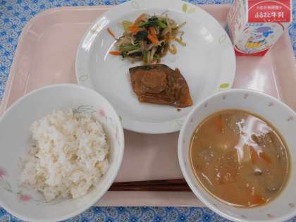 ☆献立 麦ごはん さばのみそ煮 野菜のおかかかけ 呉汁 牛乳