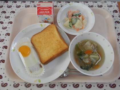 ☆献立 ふたご座たまごのエッグトースト 野菜スープ ポテトサラダ 牛乳
