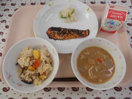 ☆献立 吹き寄せご飯 鮭の南部焼き かぶの甘酢かけ 呉汁 牛乳