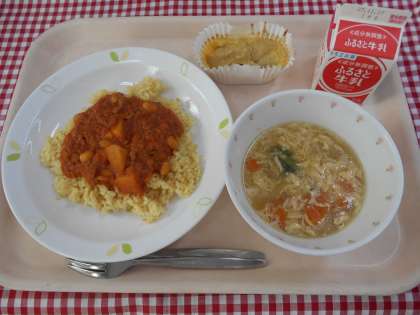 ☆献立 チリビーンズライス 洋風卵スープ りんごのファーブルトン 牛乳