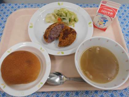 ☆」献立 米粉入りパン 牛乳 紫いものコロッケ フレンチサラダ コンソメスープ