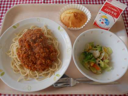 ☆献立 スパゲッティミートソース 牛乳 花野菜のサラダ パインクーヘン