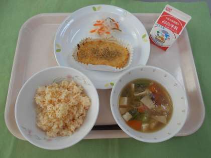 ☆献立 あけぼのごはん 牛乳 松風焼き 紅白なます 吉野汁