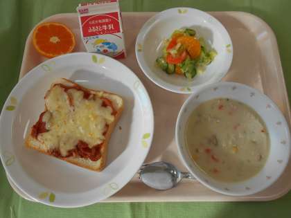 ☆献立 ピザトースト 牛乳 コーン豆乳スープ フレンチサラダ 菊花みかん