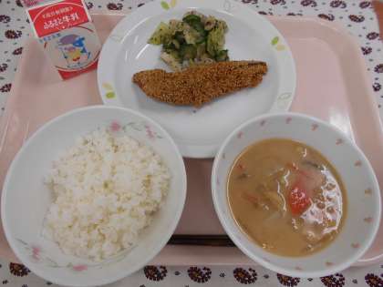 ☆献立 ご飯 牛乳 魚のごま揚げ 野菜のゆかりかけ 呉汁