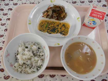 ☆献立 わかめとじゃこのご飯 牛乳 卵焼き きざみこんぶの五目煮