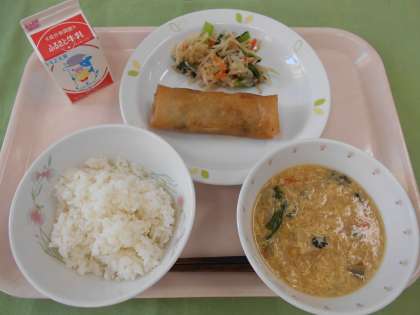 ☆献立 麦ごはん 牛乳 小松菜と豚キムチの春巻き 切り干し大根のナムル 中華風卵スープ
