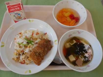 ☆献立 五目すし 牛乳 鶏肉の七味焼き すまし汁 フルーツポンチ
