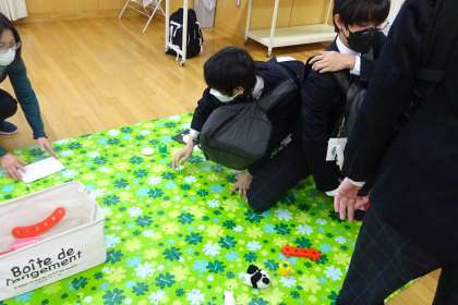 生命の誕生や出産について教えていただくと同時に、6〜7キロ相当のバッグを前に抱えながら、靴下を脱ぎ破棄したり、赤ちゃんの遊び道具を片付けてみたり、妊婦さんの立場に立って体験しました。