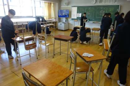3年美化活動 公開日 2024/03/15 更新日 2024/03/15 今日のできごと 3年間、お世話になった机、イスをはじめ学校にある物に感謝しながら美化活動を行いました。地道な作業ではありますが、机、イスに貼ってある自分の名前が書いてあるラベルはがしから始まりました。 感慨深さを感じた生徒も多いことでしょう。 いいね(0)