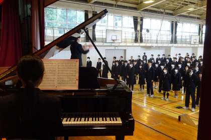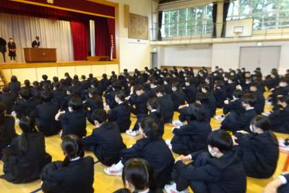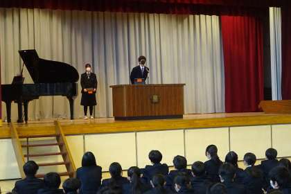 早いもので1年が終わり、令和5年度修了式で締めくくりです。代表生徒の言葉が述べた言葉は、大きな成長があったことがはっきりとわかるものでした。もちろん課題もありますが、4月から一つ一つ頑張っていってほしいと思います。代表生徒が修了証を受け取り、校歌斉唱しました。
