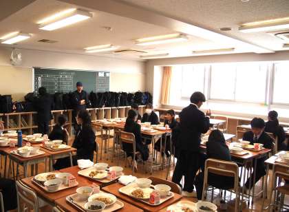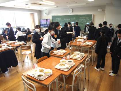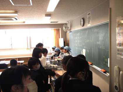 1年生の給食は今日で3日目。まだクラスの友達にも慣れていない中ですが、当番の生徒はかなり頑張って、はやめの配膳に取り組んでいます。それに協力する他の生徒も立派です。担任もエプロンとバンダナ姿で見守る中、桜木中学校第78回目の新入生は順調なスタートを切っています。(菅野)