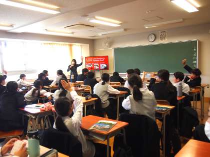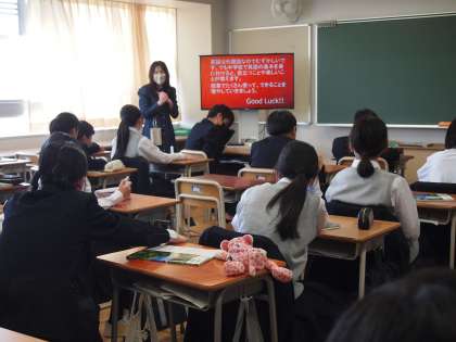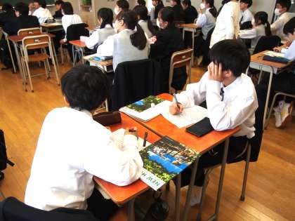 中学生になってまず気になるのは授業でしょう。小学校から学んでいるとはいえ、英語は特に難しくなる、と不安に思う1年生も多いはず。そんな不安な気持ちを察しつつ、英語の先生はまず自分自身の自己紹介をクイズ形式で始めています。「私が好きな日本食は次の3つの中のどれでしょう?」「私が行ったことのある国は何か国でしょう?」皆真剣に考えています。最後に先生から「英語は外国語なので難しいこともありますが中学で身につけることができれば役立つことや楽しいことが増えるので、頑張って授業でたくさん英語を使ってみましょう」とアドバイスがありました(菅野)