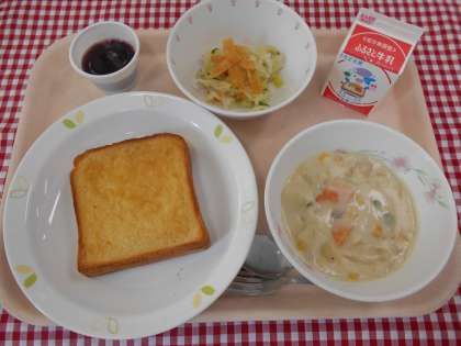 ☆献立 はちみつレモントースト 牛乳 コーンシチュー パリパリサラダ ぶどうぜりー