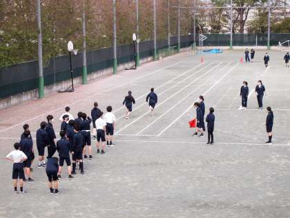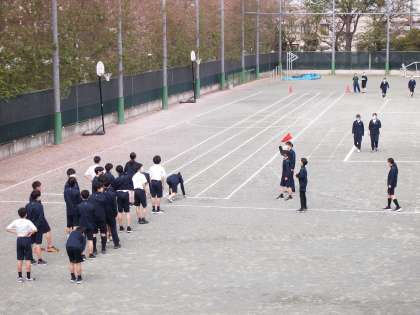 南寄りの春の風が心地よい今日の校庭です。3年生は体育の授業で短距離走に取り組んでいます。当たり前に思われるかもしれませんが、走り終えた生徒が次の順番を待つまで、列を崩さずきちんと待っています。桜木中の3年生としての成長と自覚が感じられる画像です(菅野)