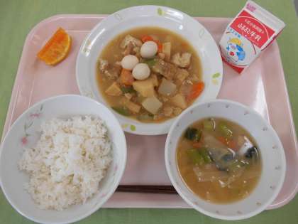 ☆献立 麦ごはん 牛乳 春野菜のうま煮 小松菜と油揚げのみそ汁 デコポン