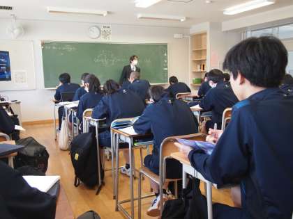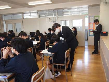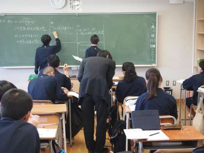 3年生の数学は多項式の乗法を学習しています。問題の解答を指名した生徒が黒板に書いている間に、先生は生徒の間を回りながら質問に答えたりアドバイスをしていました(菅野)