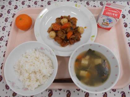 ☆献立 麦ごはん 牛乳 酢豚 わかめスープ 冷凍みかん