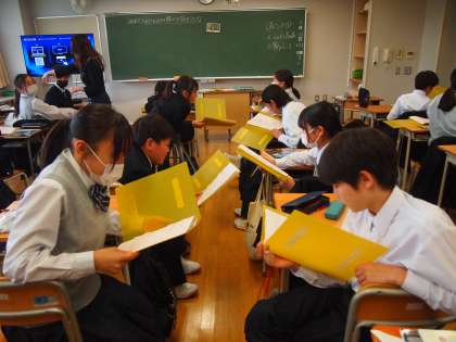 1年生の英語です。定番のビンゴから始まりペアワークも集中して取り組んでいます。特にペアワークがみな実に楽しそうに」笑顔で取り組んでいます(菅野)